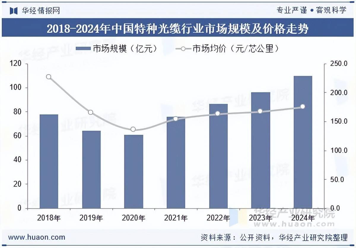 中国特种光缆行业呈现“后发先至”的增长态势。据统计,2018-2024年我国特种光缆行业市场规模从78.16亿元增长至109.8亿元,CAGR为5.8%。2024年我国特种光缆行业市场均价约为174.8元/芯公里。